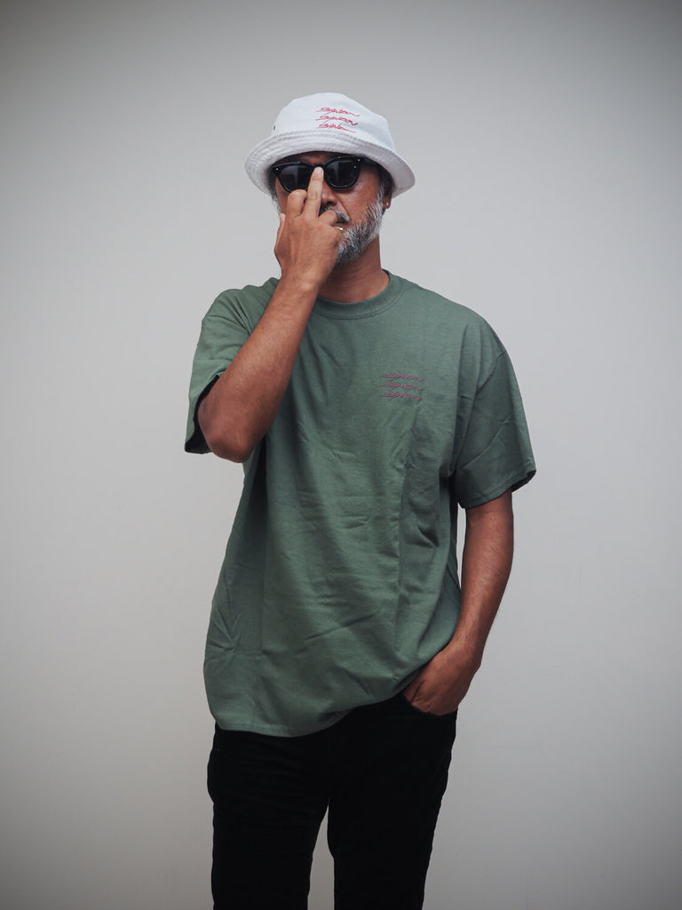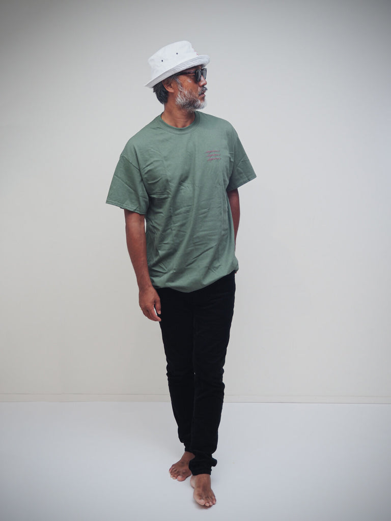 LAを拠点にヴァージル・アブロー Virgil Ablohやエイサップ・ロッキー A$AP Rocky、ニッキー・ミナージュ Nicki Minajなどセレブリティらのカバーロゴをハンドレタリング&カリグラフィーで表現する人気アーティスト、デュウォン Duong Nguyen氏によるSANZOUスペシャルロゴをフロント胸元に刺繍デザインしたTシャツ。バックには3匹のゾウが愛らしいアクセント。