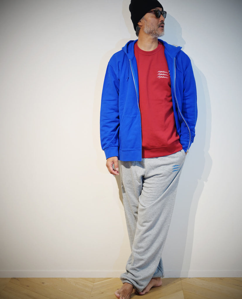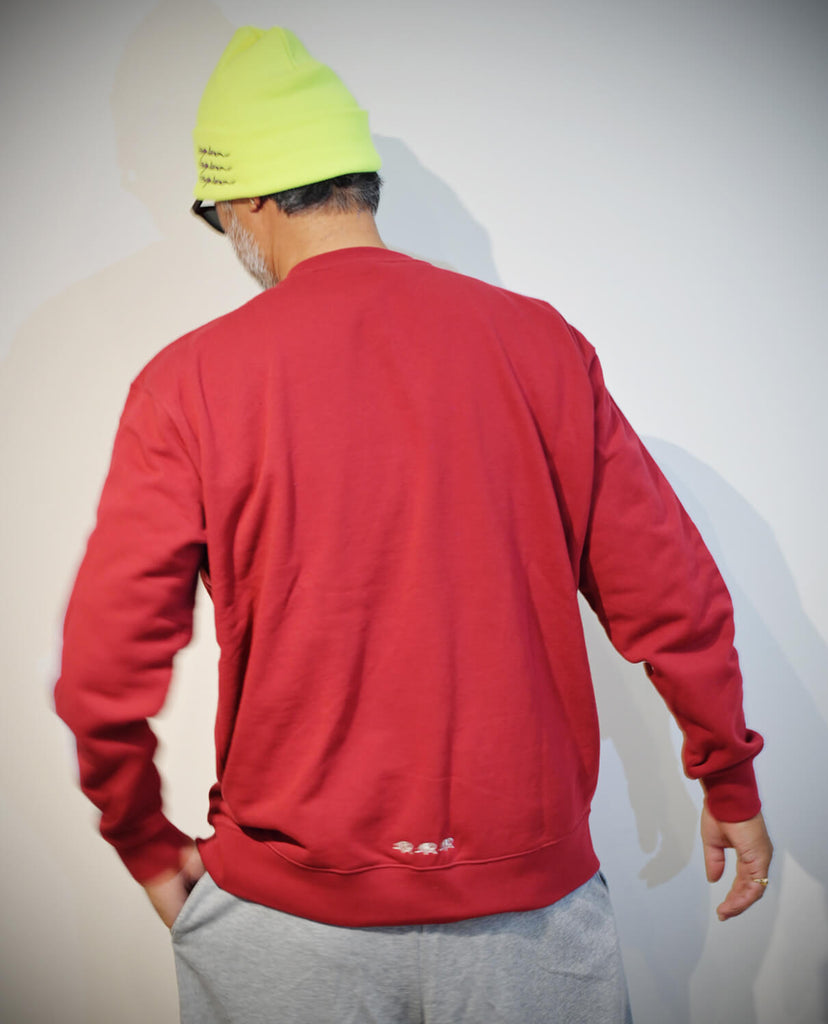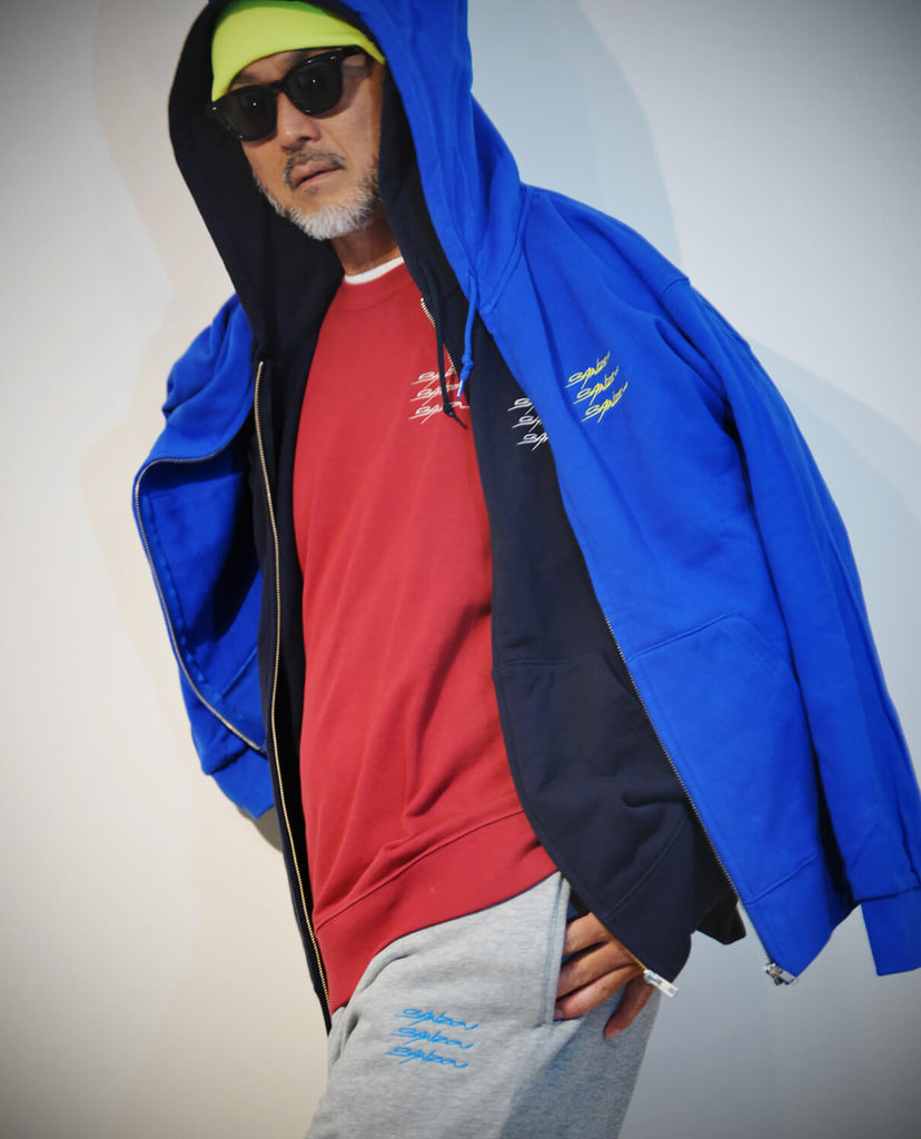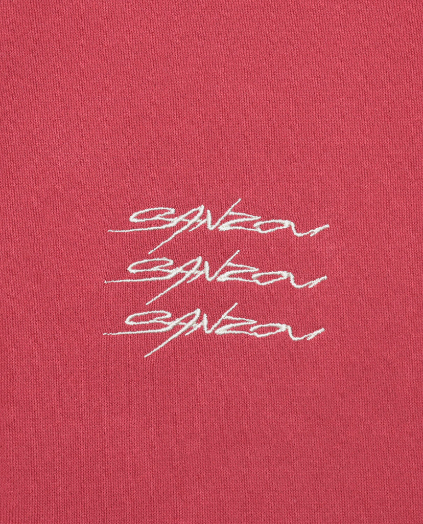 LAを拠点にヴァージル・アブロー Virgil Ablohやエイサップ・ロッキー A$AP Rocky、ニッキー・ミナージュ Nicki Minajなどセレブリティらのカバーロゴをハンドレタリング&カリグラフィーで表現する人気アーティスト、デュウォン Duong Nguyen氏によるSANZOUスペシャルロゴをフロント胸元に刺繍デザインしたクルーネックスウェットトップ。バックには3匹のゾウ刺繍が愛らしいアクセント。