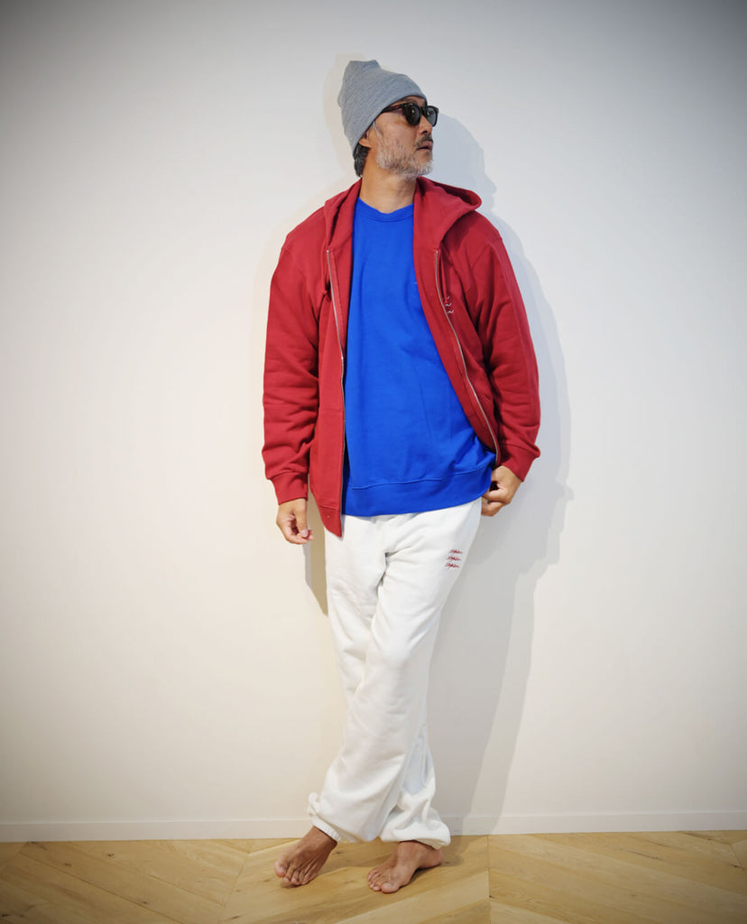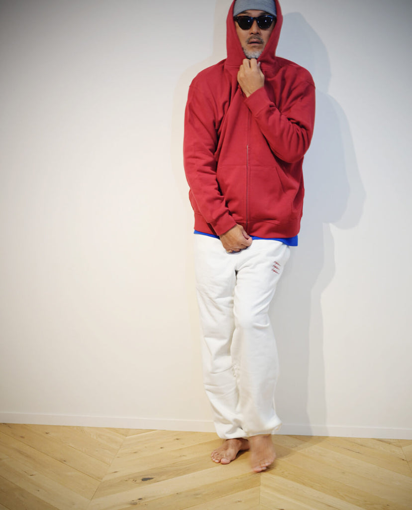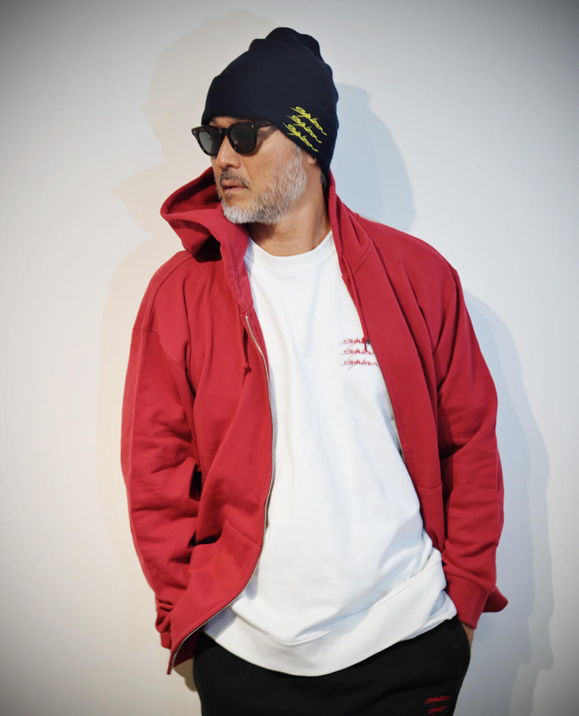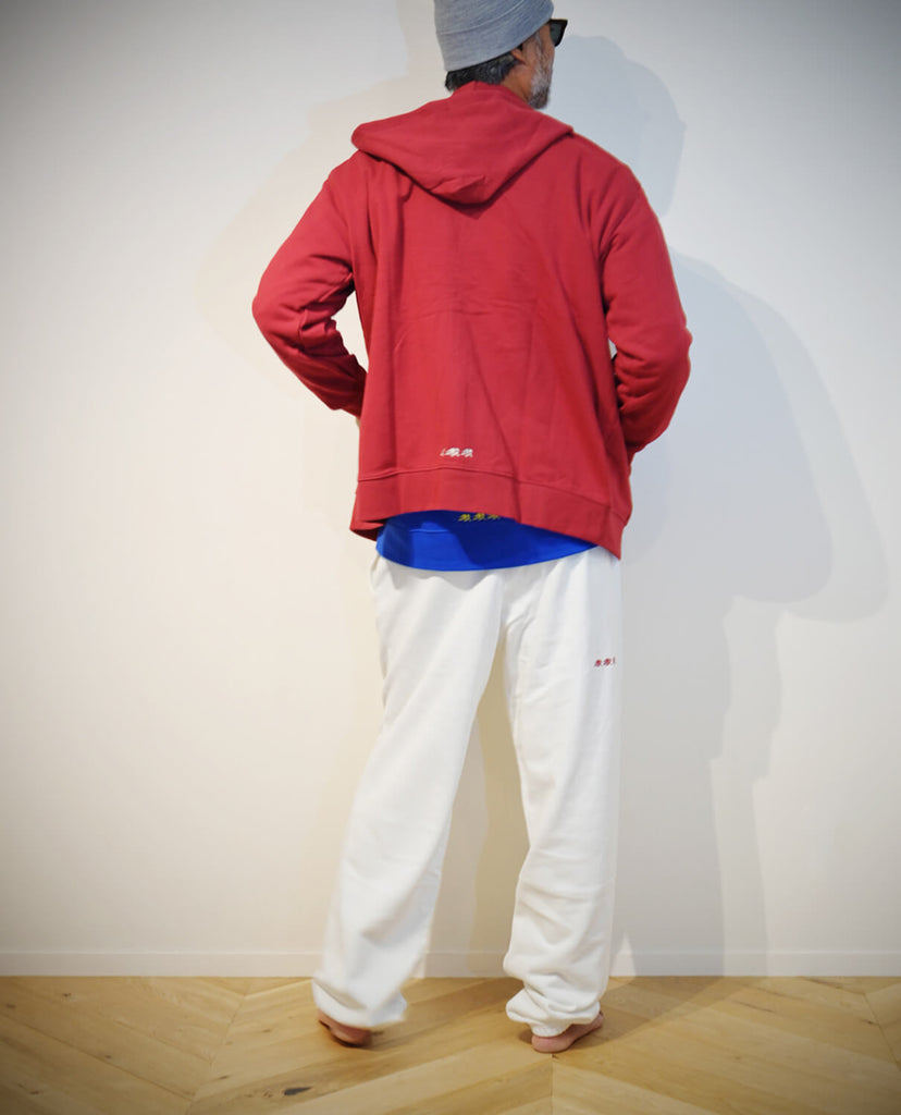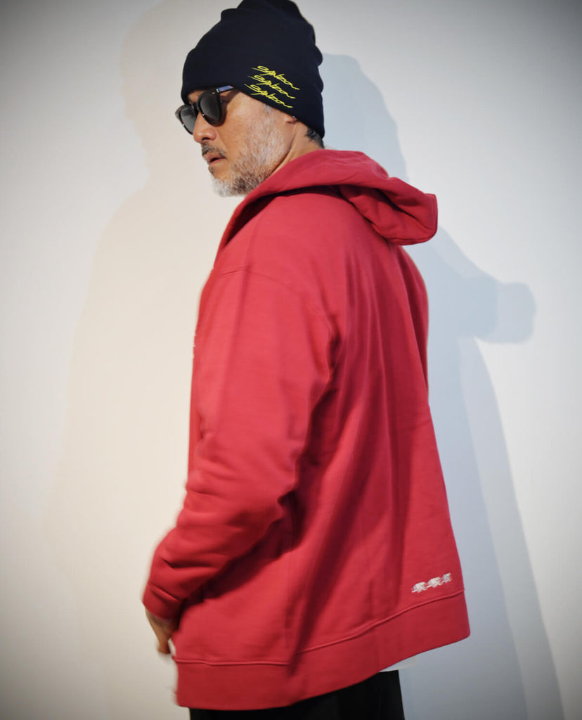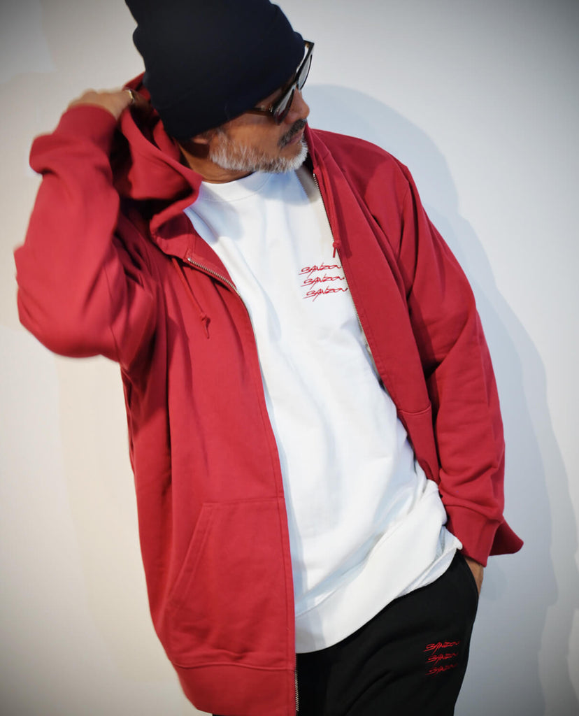 LAを拠点にヴァージル・アブロー Virgil Ablohやエイサップ・ロッキー A$AP Rocky、ニッキー・ミナージュ Nicki Minajなどセレブリティらのカバーロゴをハンドレタリング&カリグラフィーで表現する人気アーティスト、デュウォン Duong Nguyen氏によるSANZOUスペシャルロゴをフロント胸元に刺繍デザインしたフード付きジップアップパーカースウェットトップ。バックには3匹のゾウ刺繍が愛らしいアクセント。(SANZOUオリジナルロゴステッカー付)